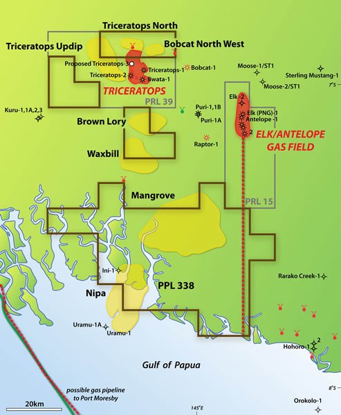 Success at Elk/Antelope (2006-2013), and Triceratops (20xx) located only 30 km to the north east of PPL 338, confirmed the viability of the Eocene and Miocene limestone reef play. Most recent success by Interoil at Triceratops encouraged the PPL 338 Joint Venture to investigate a possible extension of the Triceratops discovery into northern PPL 338. PPL 338 is on a reef carbonate fairway running from Pandora in the south through Pasca, Uramu and continues up to Elk/Antelope and Triceratops.